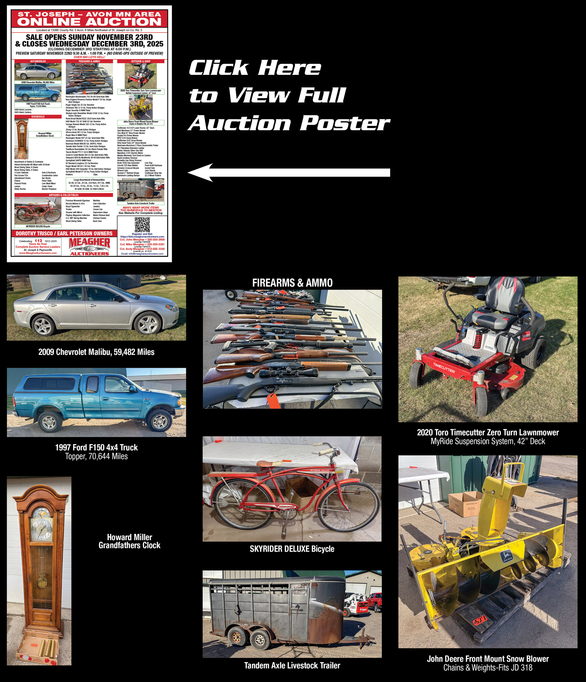 Meagher Auctioneers • Your complete auction service leaders since 1912! St. Joseph & Paynesville, Minnesota. Meagher Auctioneers have been in the auction business since 1912 with 2nd & 3rd generation full-time auctioneers.